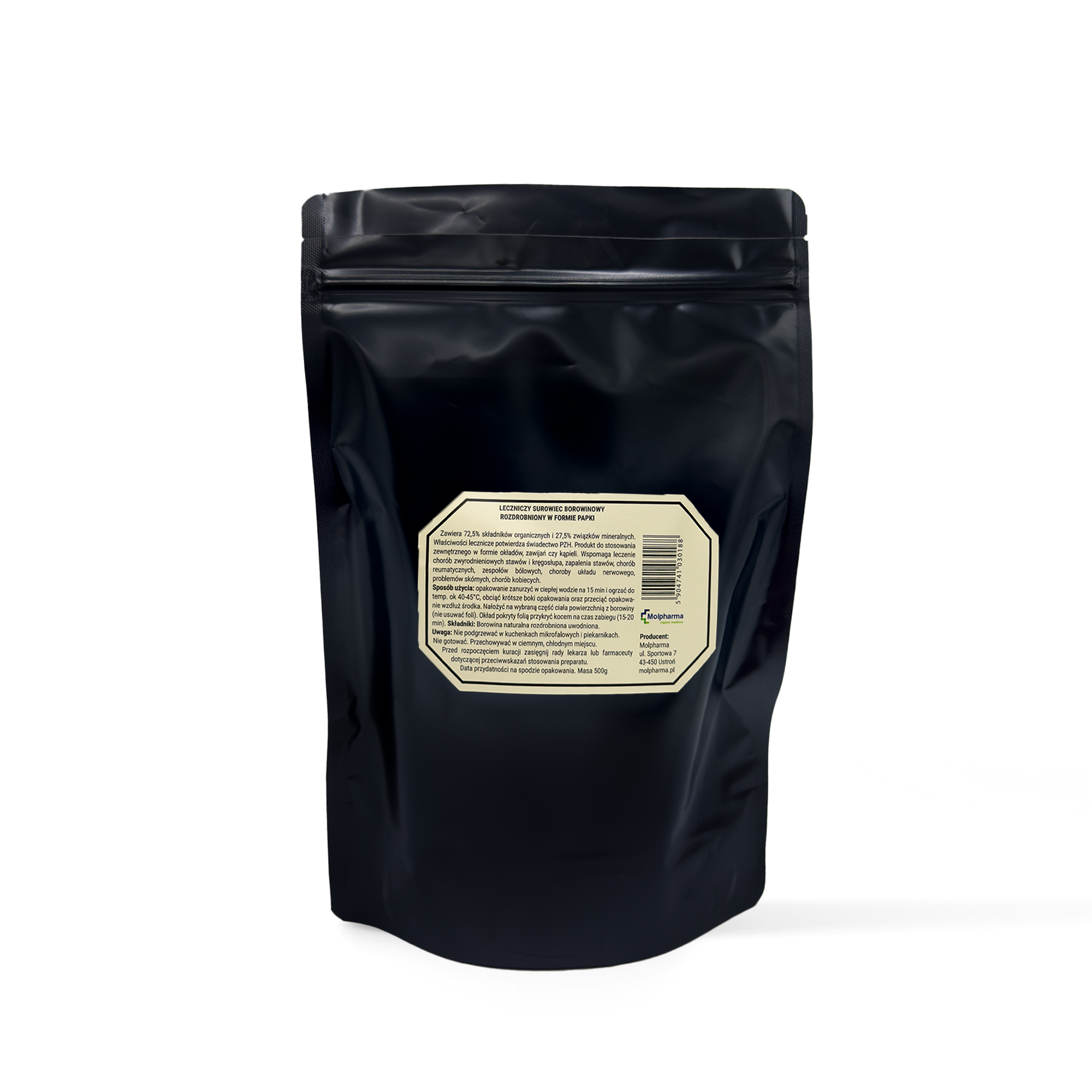 Naturalny surowiec borowinowy rozdrobniony w formie papki. Opakowanie zawiera okład borowinowy gotowy do użycia po podgrzaniu.