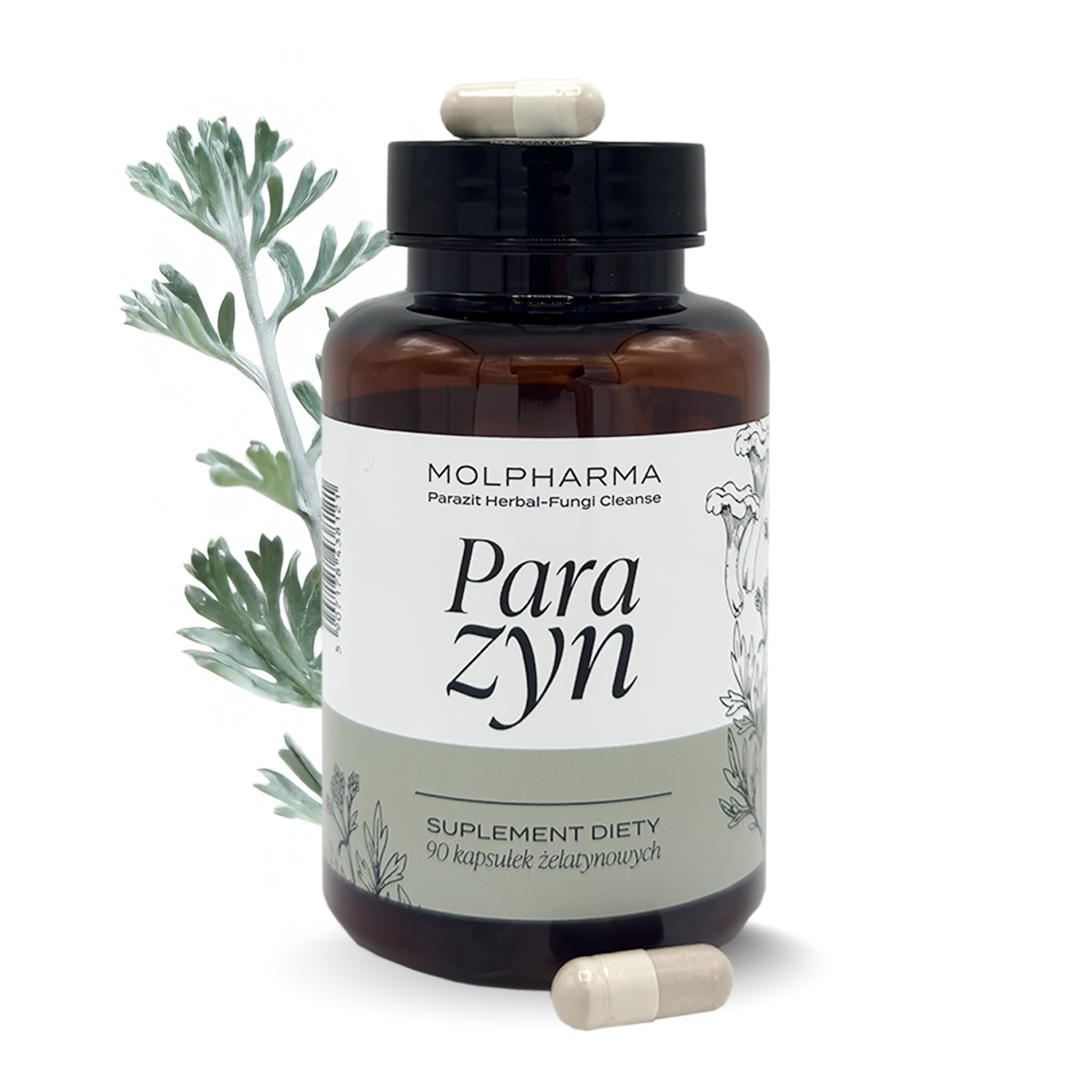 Parazyn to naturalny suplement diety zawierający starannie dobraną mieszankę ziół: piołun (Artemisia absinthium), kurek (Caryophyllus aromaticus) i goździków (Syzygium aromaticum). Te tradycyjne przyprawy są bogate w polifenole, flawonoidy i olejki eteryczne (m.in. tujon, eugenol), które charakteryzują się silnymi właściwościami przeciwutleniającymi, wspomagającymi ochronę komórek przed stresem oksydacyjnym. Mieszanka ziołowa wspiera trawienie i dobre samopoczucie po posiłkach. Produkt nie zawiera sztucznych dodatków, konserwantów ani GMO. Jest odpowiedni dla wegan.
